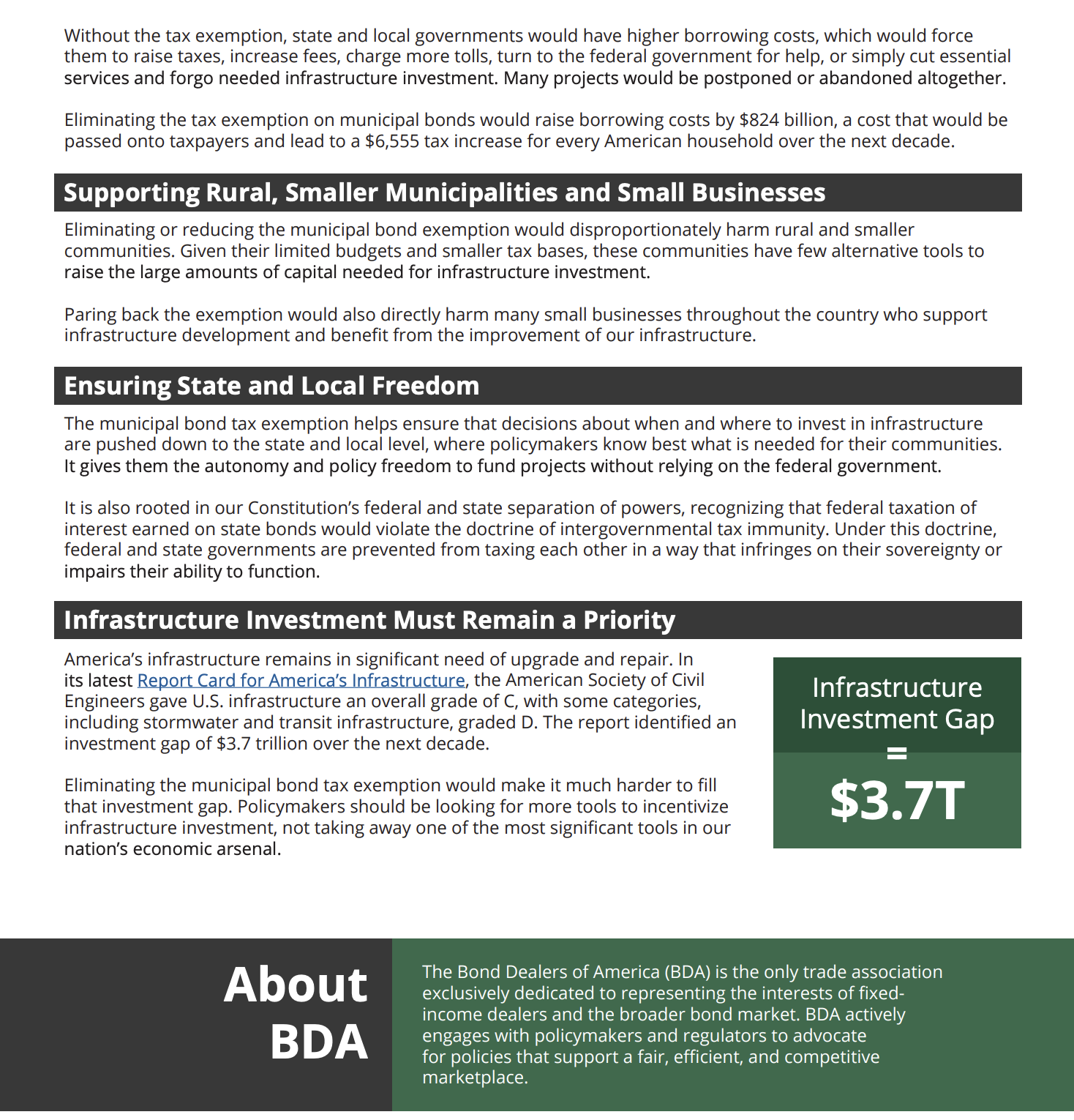 The BDA continues its educational efforts in both the House and the Senate with eyes squarely focused on 2025 when portions of the 2017 Tax Cuts and Jobs Act expire and provisions to pay-for extensions of the tax cuts will likely be debated. The municipal bond tax-exemption remains a top-10 tax expenditure for the federal government—making it a potential target to use as an offset for additional spending as concerns continue to grow on the debt and annual deficit.