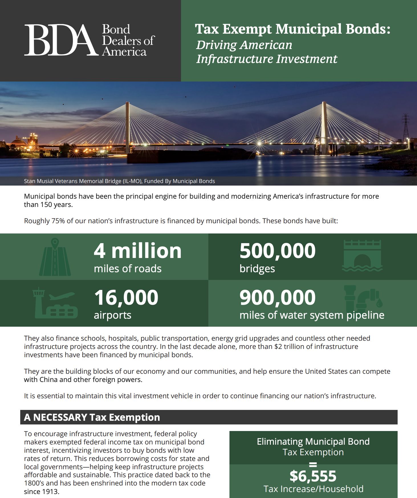 The BDA continues its educational efforts in both the House and the Senate with eyes squarely focused on 2025 when portions of the 2017 Tax Cuts and Jobs Act expire and provisions to pay-for extensions of the tax cuts will likely be debated. The municipal bond tax-exemption remains a top-10 tax expenditure for the federal government—making it a potential target to use as an offset for additional spending as concerns continue to grow on the debt and annual deficit.